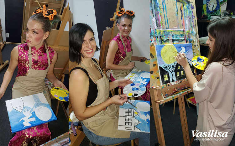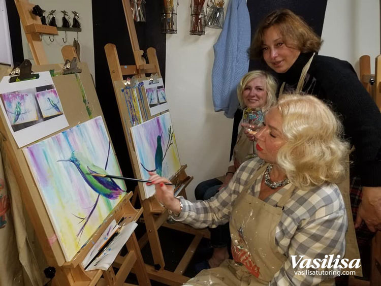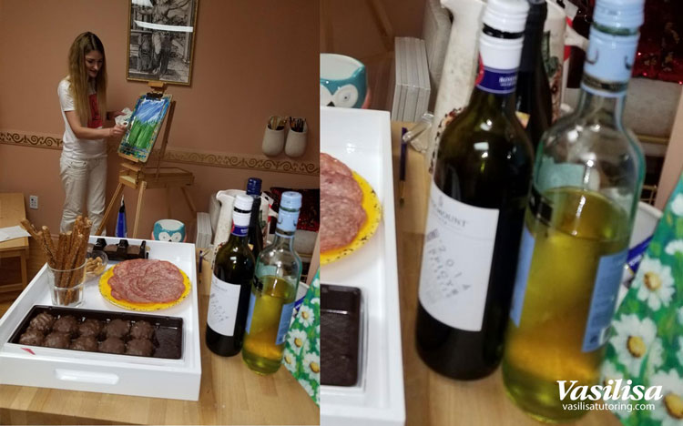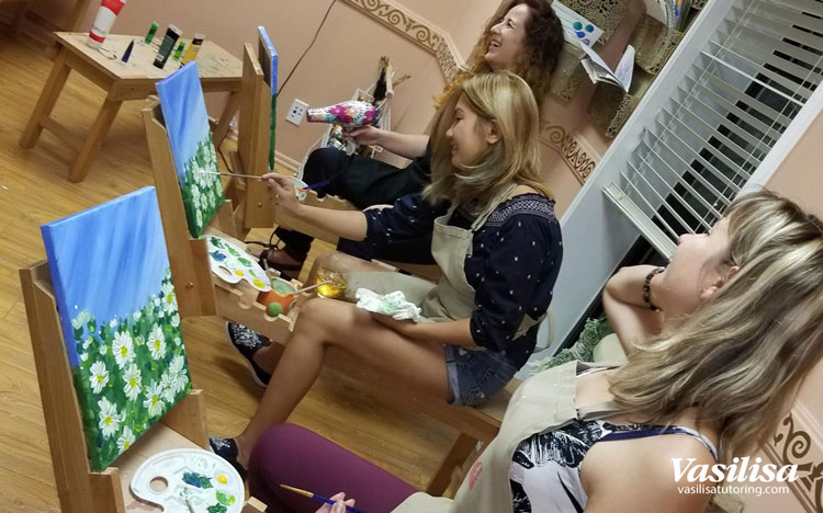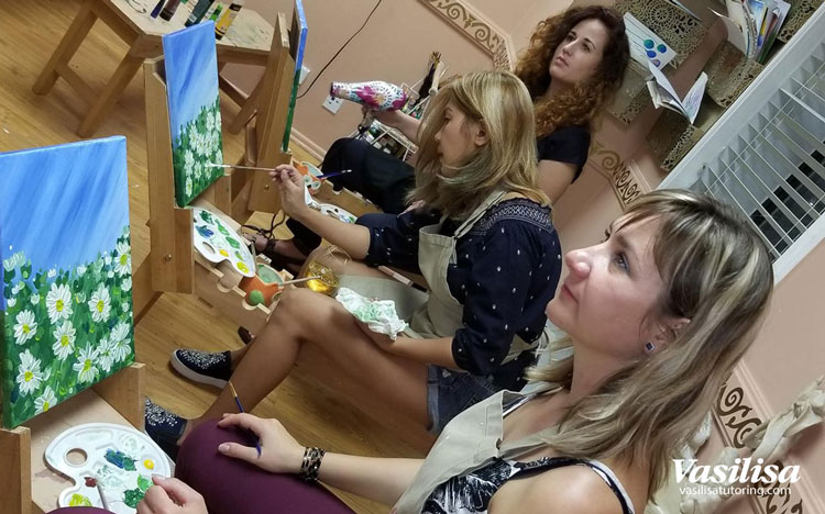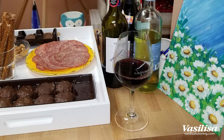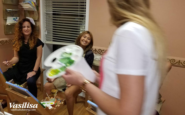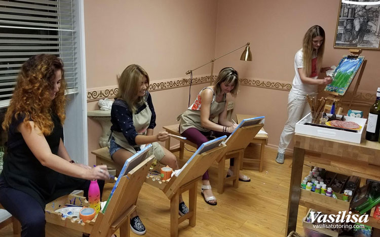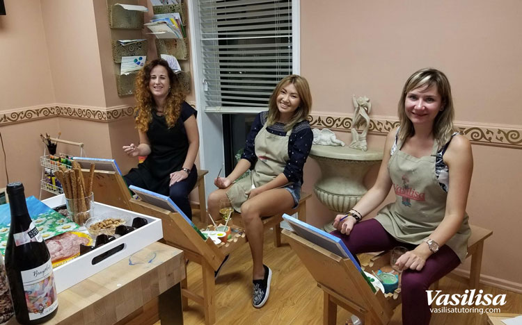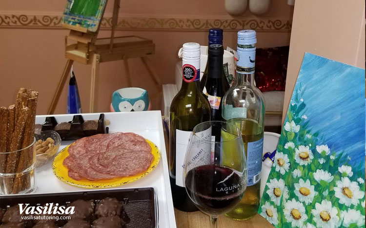 Wine tasting while painting has lately become a trendy and popular evening activity in L.A. And for a good reason. Just imagine yourself sitting relaxed and meditating about life with the glass of red Beaujolais or white Sauvignon Blanc, and at the same time painting something romantic. Quiet and pleasant music creates the atmosphere of serenity, and even if you have rarely painted before, you would definitely produce something original, maybe even mysterious. Who knows! But there is more to it! Your little one is also busy. He or she is learning Russian or Spanish in the next room, or plays chess and solves some difficult math problem while you are enjoying that glass of wine. We invite all mothers and fathers to participate in our wine-art tasting classes while your kids learn something in our center.