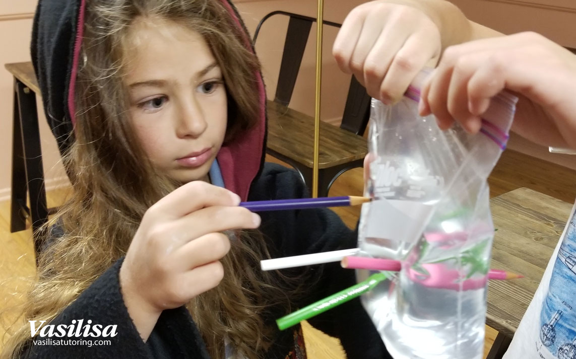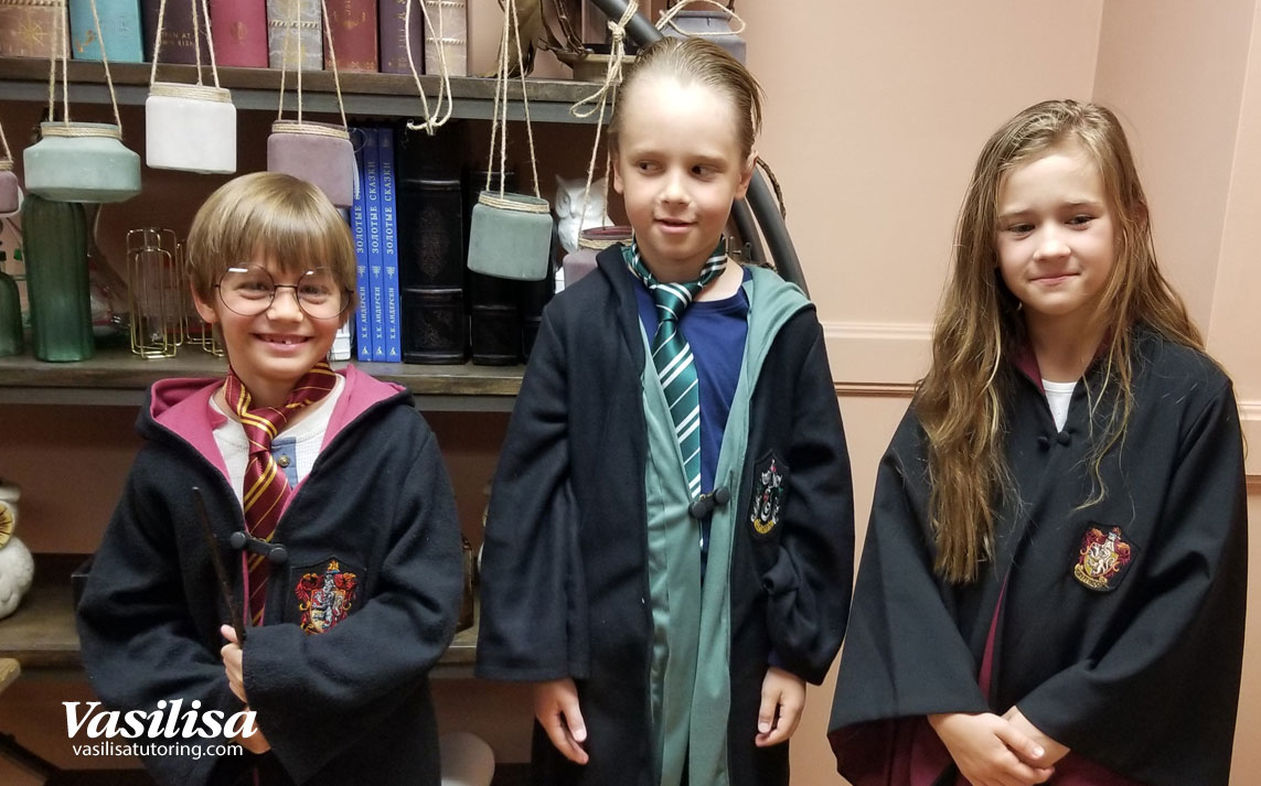 - Дети под руководством учителя наряжаются в костюмы (предоставляем 5 костюмов для детей и два костюма для взрослых). Распределяются по факультетам при помощи волшебной шляпы. Далее проводится класс «Цветные реакции». Этот увлекательный класс не даст заскучать вашим детям. Продолжительность класса 1 час 15 минут.